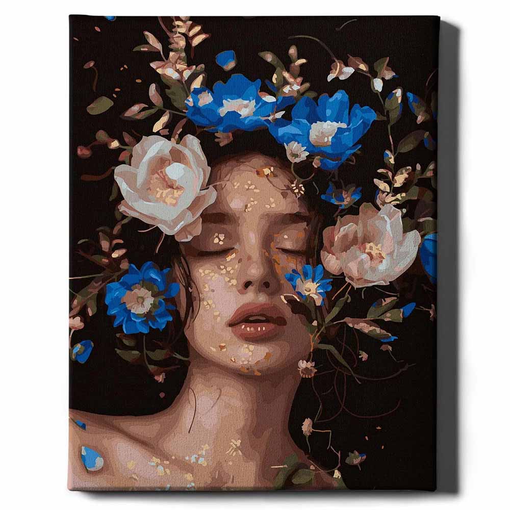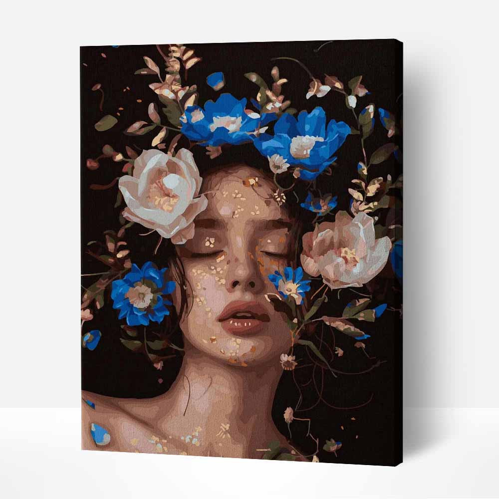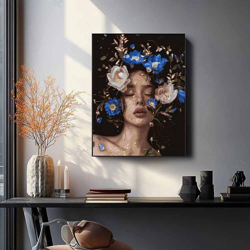 Női Portré Kék Virágokkal – Számfestő – Arany Festékekkel